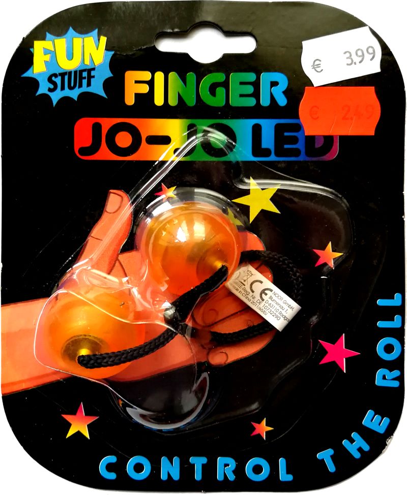 Bei diesem Finger-Jo-Jo scheint der ganz große Hype zumindest wirtschaftlich wohl ausgeblieben zu sein. Das zeigen schon die Preisschilder: Das Fingerspielzeug sollte wohl ursprünglich 3,99 € kosten und wurde inzwischen schon auf 2,49 € heruntergesetzt – nicht unbedingt ein Zeichen für eine sehr hohe Nachfrage.